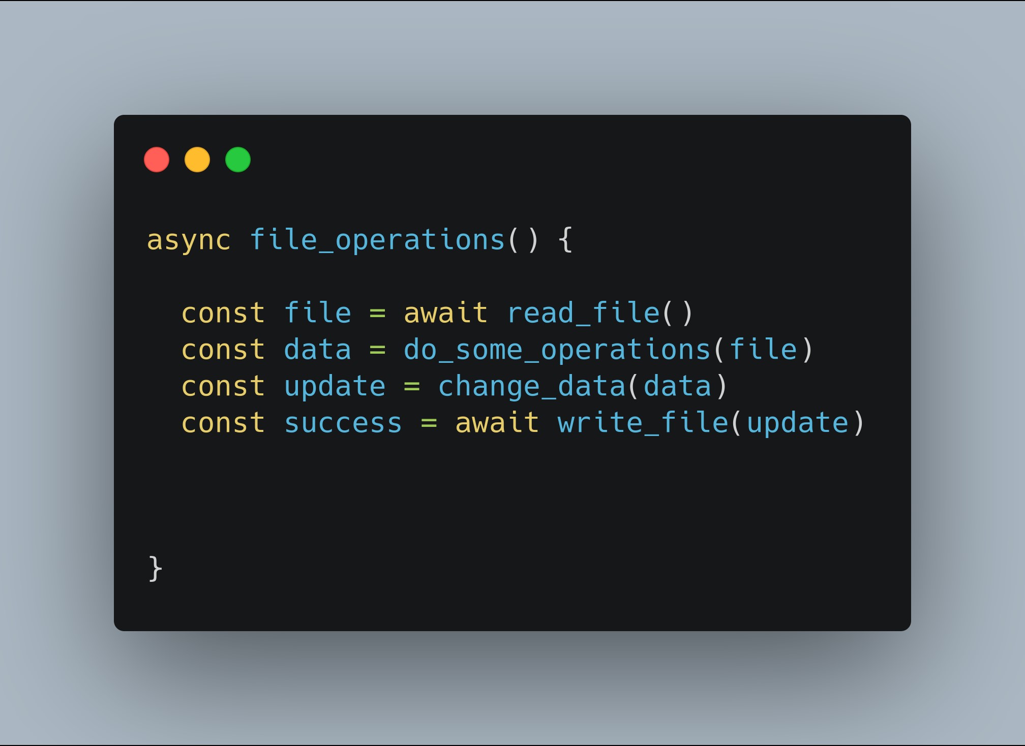 You might be confused by seeing the async/await but these two are really powerful things. First of all, this is an asynchronous code block. It means that when some blocking operations occur, CPU is free to use its resources for other tasks in OS. when the task is complete it will return the output to file which then can be processed further. Believe it or not, you might see a huge spike in your code performance if you start using it correctly. Javascript uses this thing by default but we have to integrate it manually to other programming languages.