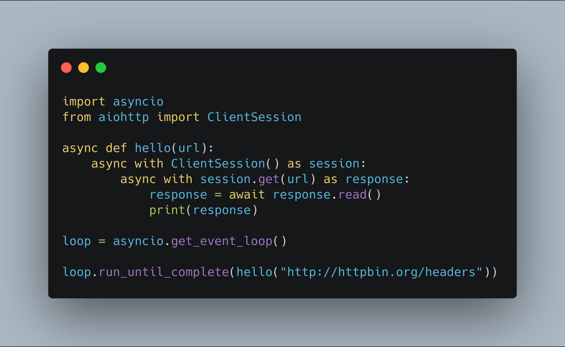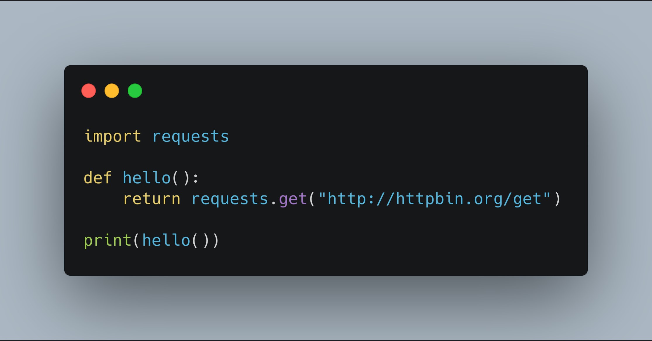 The code block calls the hello function which includes a code line that sends an HTTP get-request to an API and once the response is returned it prints the output. The problem with this is the same. Until and unless the output is returned, it hangs there and waits.